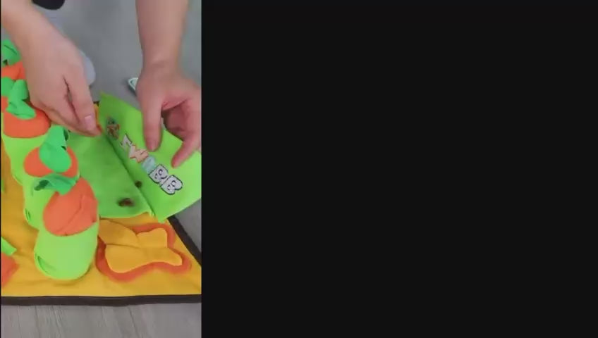 Made from high-quality, pet-safe polyester with durable stitching. Features rich grass-like textures for hiding treats, a squeaker in the center petal, five carrot-shaped pockets, and crinkle paper elements to spark curiosity and endless fun.